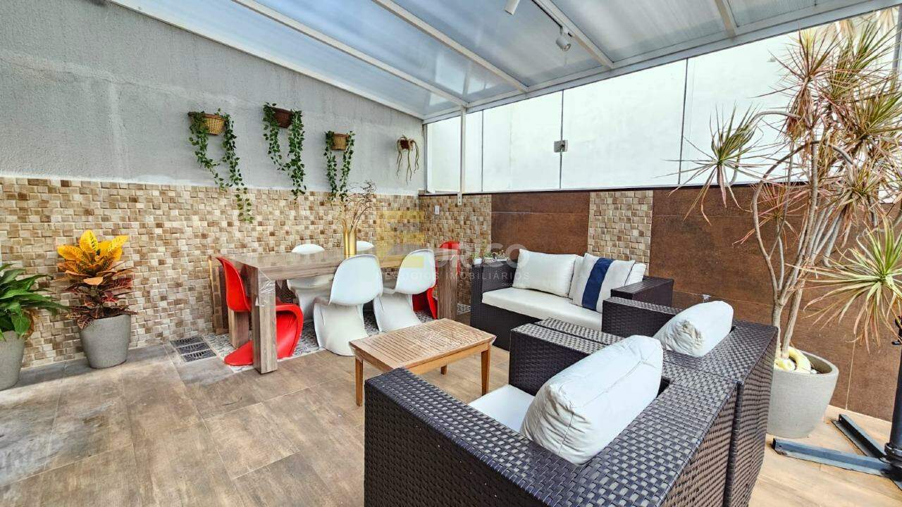 Sobrado com três quartos, sendo três suítes, todos com varanda, 02 quartos com ar condicionado, piso laminado, sala de jantar e sala de estar com ar condicionado, cozinha com armários planejados, piso porcelanato, lavabo, despensa, área de serviço com armários, área gourmet com churrasqueira, piscina aquecida (5 x 3), e uma aconchegante área coberta para receber amigos e familiares.