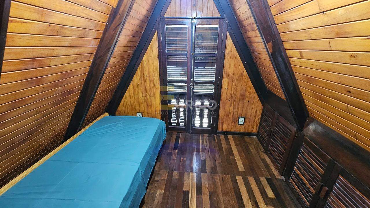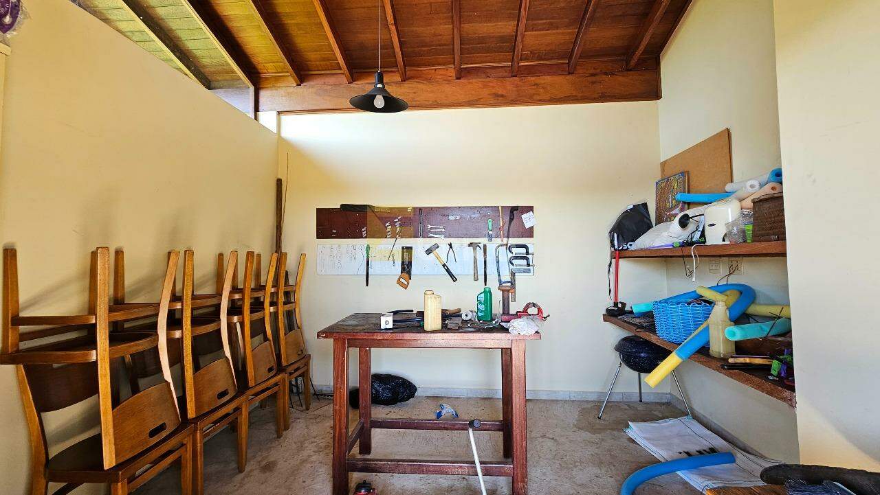 Já a área externa é um glamour a parte, conta com um encantador "Chalé" em madeira, com cozinha, banheiro com chuveiro, sala, um quarto com armários no andar inferior e dois quartos no andar superior.
