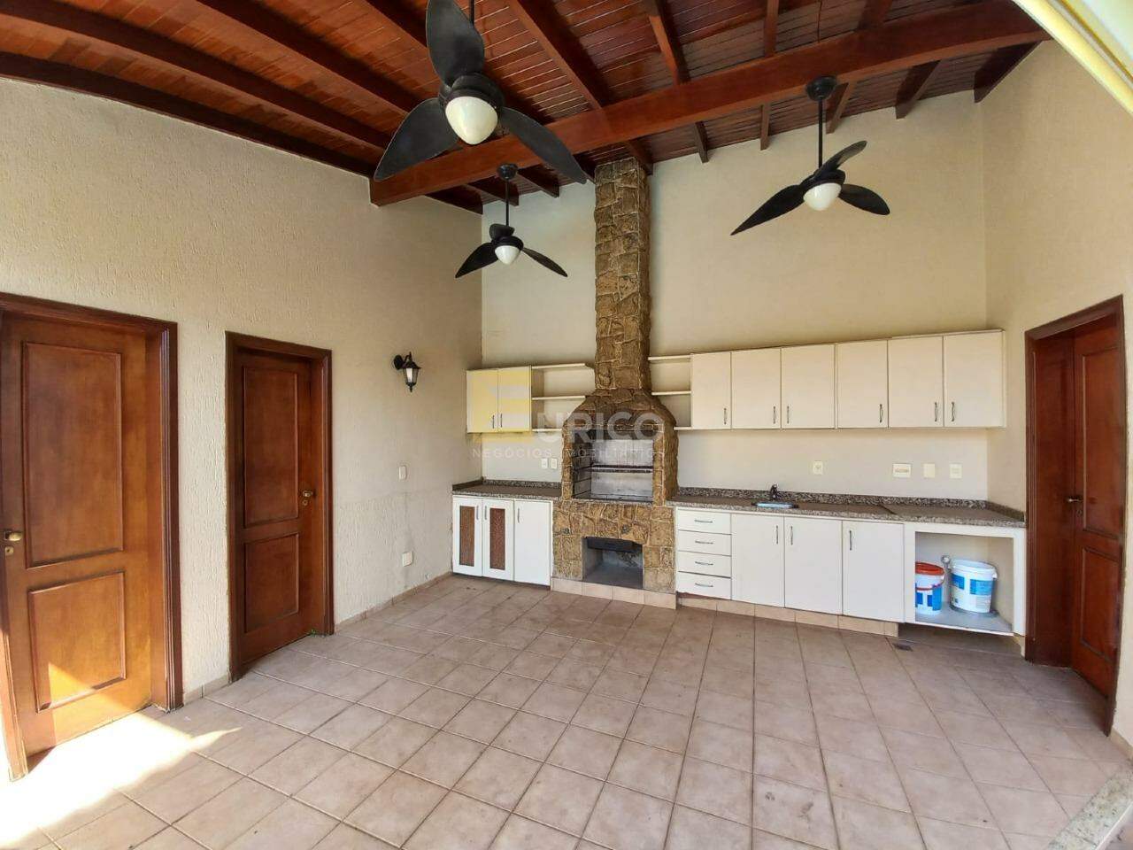 No pavimento inferior, logo na entrada, há uma sala aconchegante com lareira, um lavabo e um escritório ideal para home office ou uso pessoal. O imóvel também dispõe de duas amplas salas — uma de estar e outra de jantar — além de uma cozinha espaçosa e bem planejada. A área de serviço é independente, com armários e banheiro de apoio.