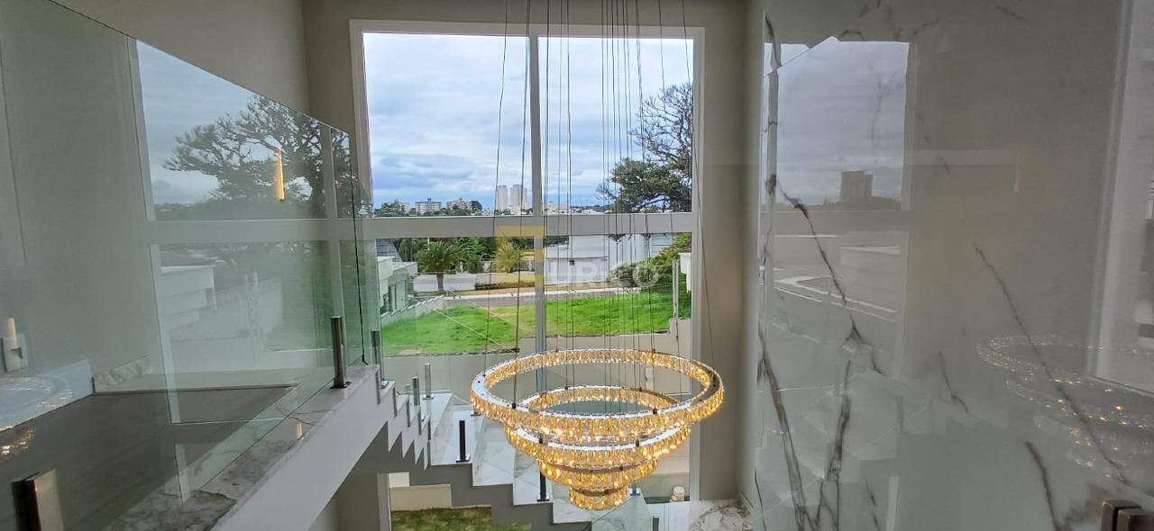 Casa nova, nunca habitada, projeto diferenciado, estilo neoclássico, pé direito duplo, ambientes amplos e integrados, muito bem distribuídos, bem arejada, ventilação e iluminação natural, rico em armários planejados, fino acabamento, porcelanato, persianas integradas e elétricas, esquadrias em PVC, iluminação em LED, aquecimento solar, ar condicionado Fujitsu quente e frio inverter, geração de energia fotovoltaica e projeto para elevador. No piso térreo temos amplo living 3 ambientes com lareira e cristaleira, sala de jantar com Buffet embutido em pedra e painel, escritório reversível em uma suíte térrea, cozinha gourmet com ilha de granito, cooktop, coifa, churrasqueira, torre quente com forno e micro ondas.